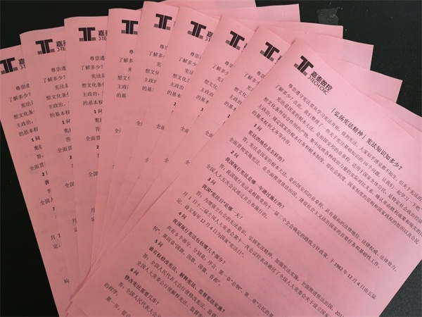 2018年12月4日是第 18 個全國法制宣傳日、第5個國家憲法日,也是第一個“憲法宣傳周”。為普及憲法知識,進一步增強員工的憲法意識、安全生產(chǎn)意識,推動全員學(xué)習(xí)的熱潮,12 月2 日-8 日,嘉泰數(shù)控圍繞“尊崇憲法、學(xué)習(xí)憲法、遵守憲法、維護憲法、運用憲法”這一主題,開展了憲法學(xué)習(xí)的系列活動。 憲法是國家的根本大法,是治國安邦的總章程,企業(yè)學(xué)習(xí)憲法,有助于提高依法治企的能力。為積極營造憲法學(xué)習(xí)的良好氛圍,嘉泰數(shù)控在廠區(qū)內(nèi)懸掛憲法宣傳標(biāo)語橫幅,在展廳LED屏輪播憲法知識,走進車間發(fā)放憲法知識資料,利用企業(yè)內(nèi)部交流渠道傳播憲法知識。 嘉泰數(shù)控黨支部號召黨員干部帶頭尊法學(xué)法守法用法,并發(fā)揮先鋒模范作用,在各個部門傳播憲法知識,弘揚憲法精神。
