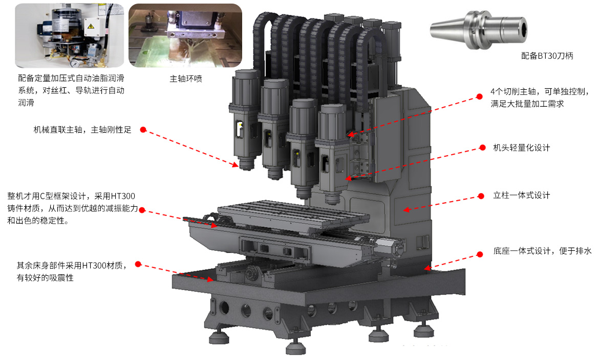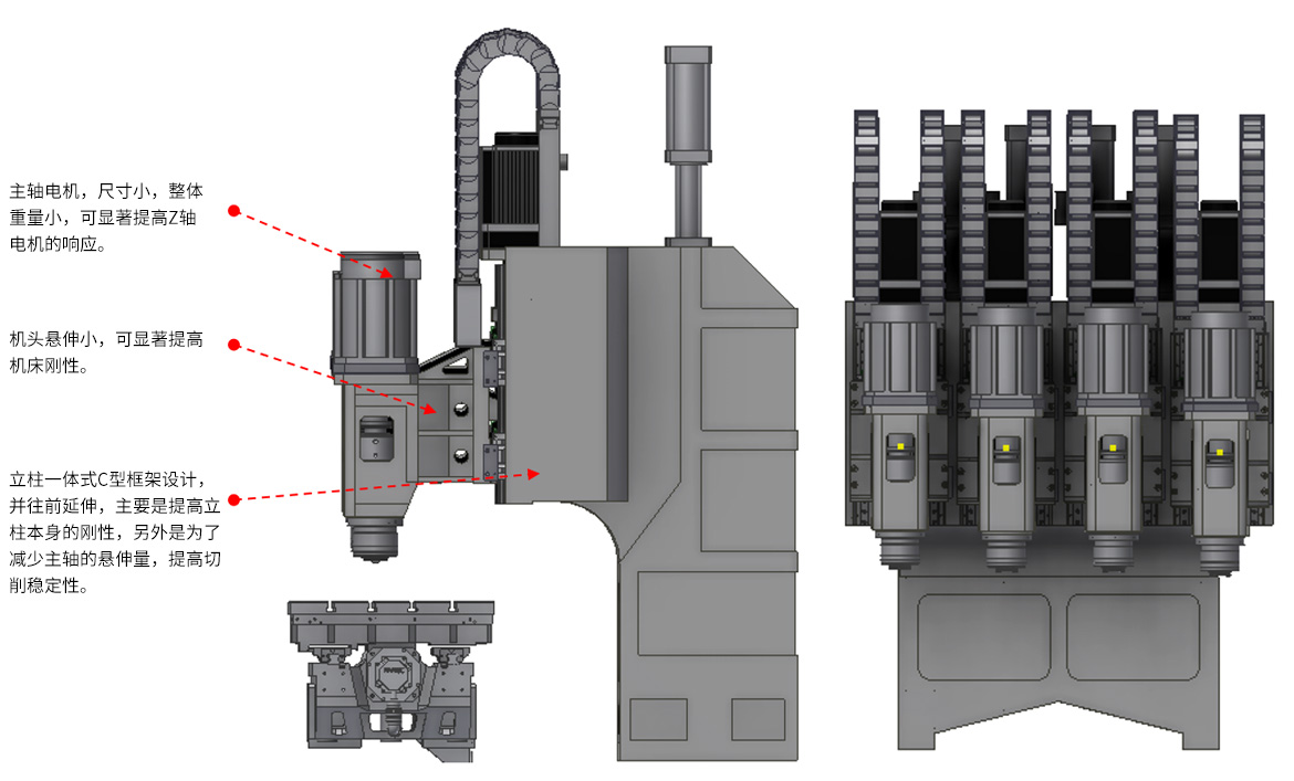 該系列產(chǎn)品主要針對(duì)2.5D、3D玻璃、的大面開(kāi)粗加工,以及外輪廓加工,4個(gè)切削主軸設(shè)計(jì),多通道可單獨(dú)控制主軸升降,并采用直聯(lián)機(jī)械主軸設(shè)計(jì),主軸切削扭矩大,對(duì)于玻璃等脆硬材料的粗加工有很大優(yōu)勢(shì)。